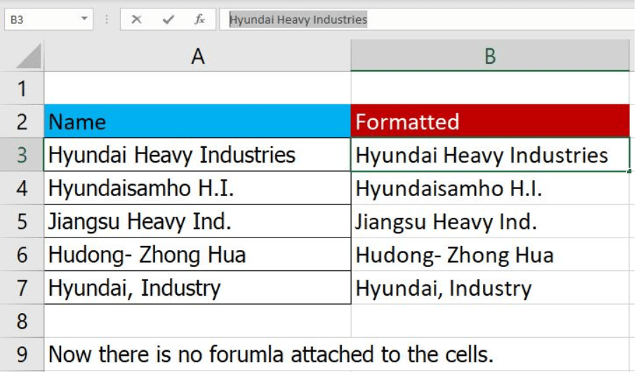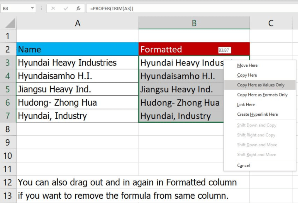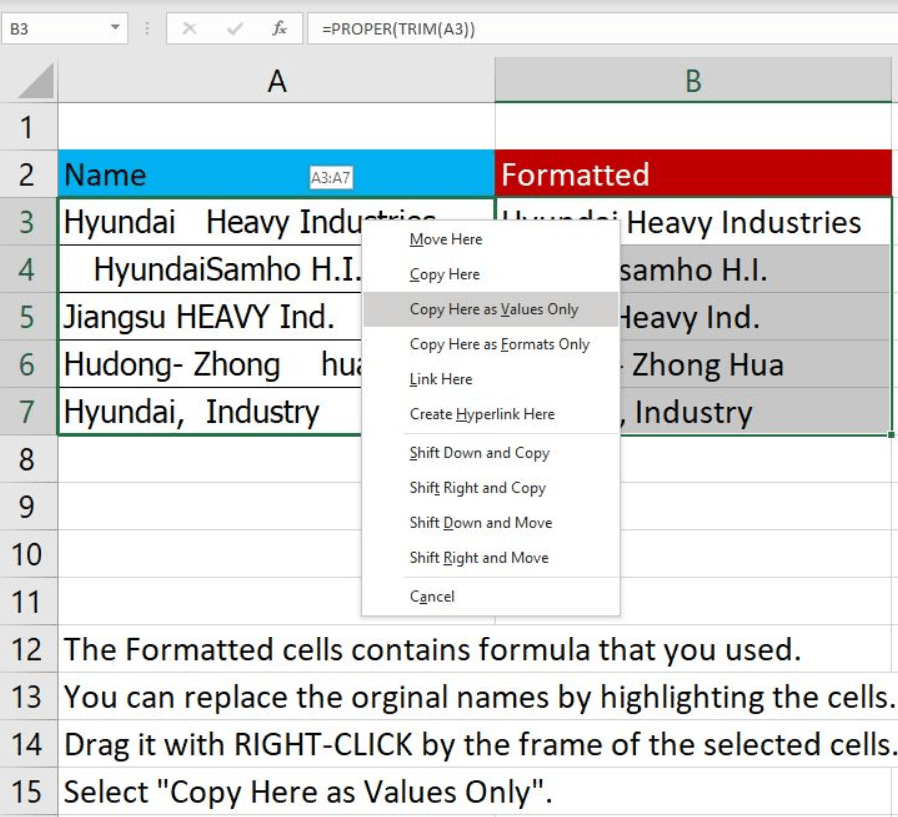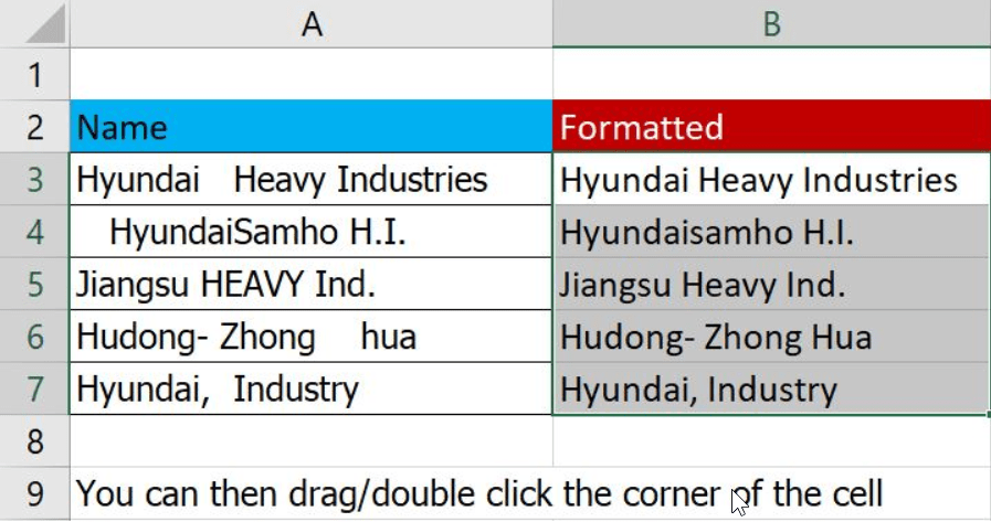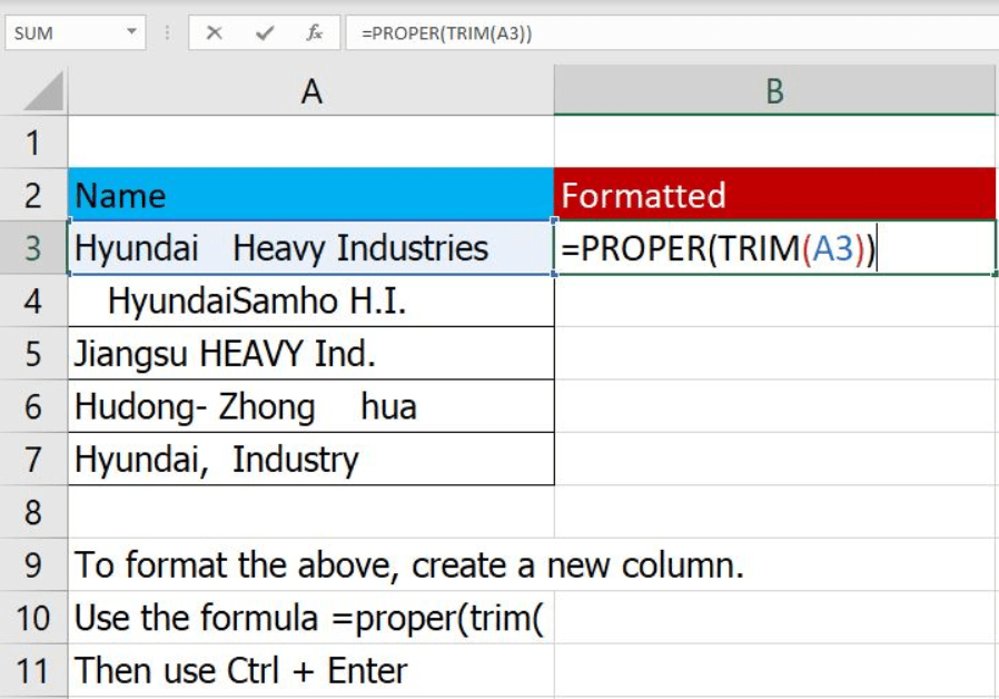 In older IT systems, data validations might not be implemented when new data is added into the database. E.g. adding a client company name. Thus, the data is poorly formatted. In order to standardize the data format, we can use PROPER() and TRIM() functions in excel. After you completed cleaning the data, you can replace the existing one in the database.