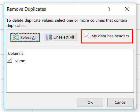Step 4: Click on ‘My data has headers’ checkbox and click on the column header to exclude during filtering. Click on ‘OK’ button.