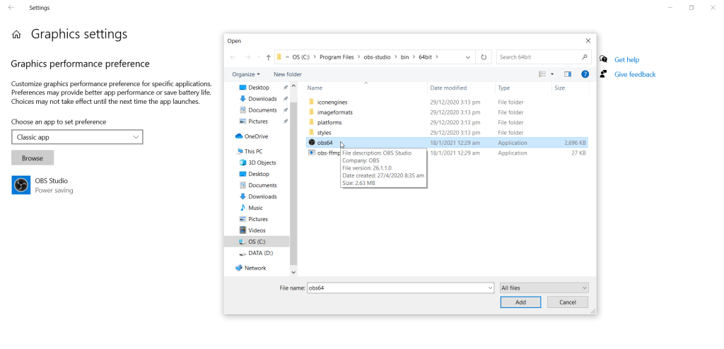 Step 3: Click on Browse and select OBS icon in C:\Program Files\obs-studio\bin\64bit