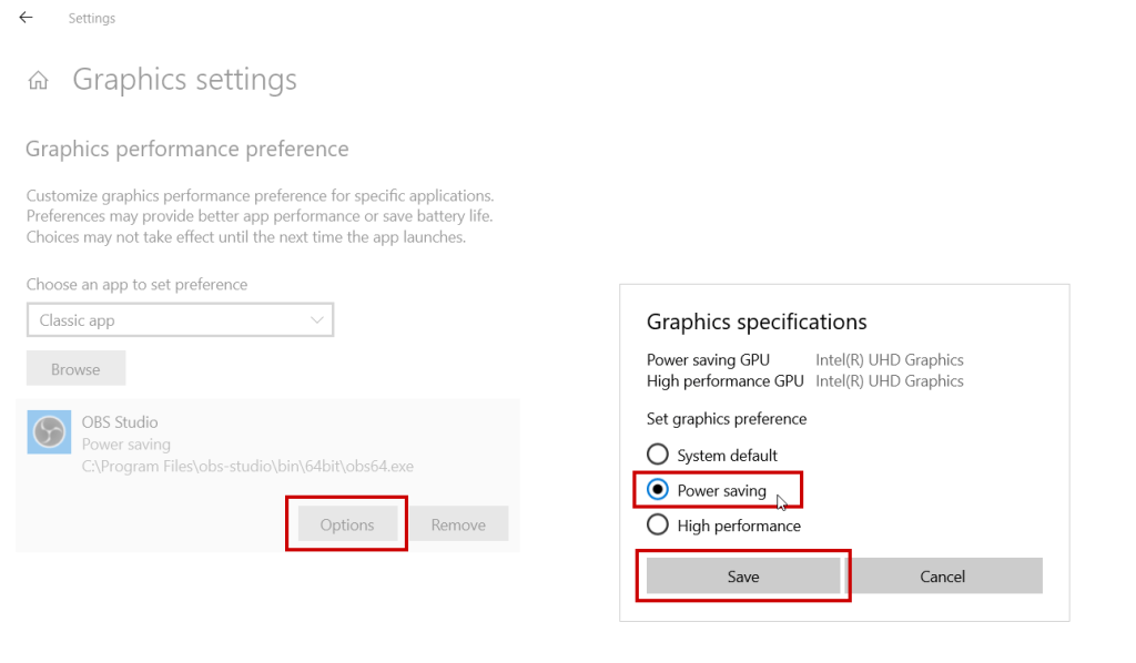 Step 4: Click on Options > Select Power Saving > Save.
